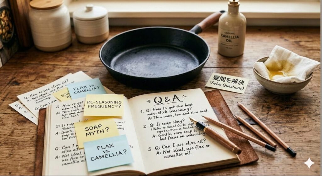 油の選び方や油ならしの詳しいやり方については、鉄フライパンのお手入れ方法まとめもあわせてご覧ください。